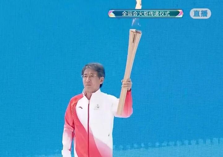 十五运会第一棒火炬手薛其坤在深圳手持火炬起跑。