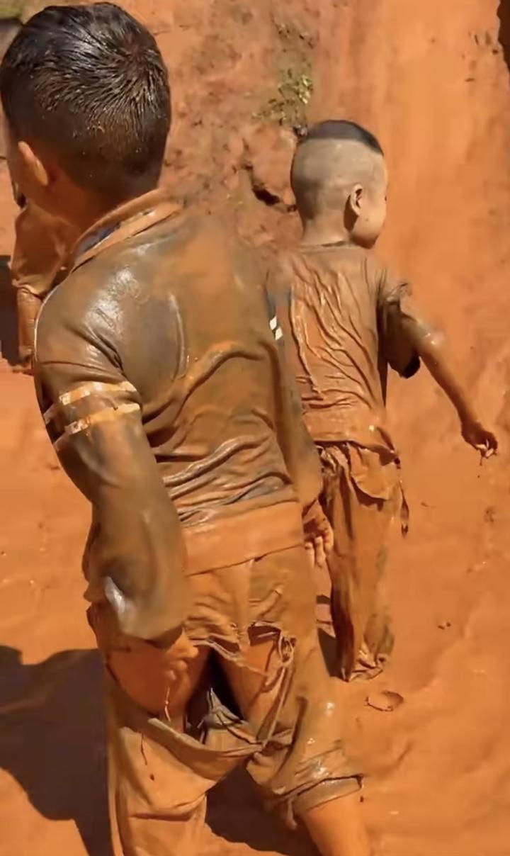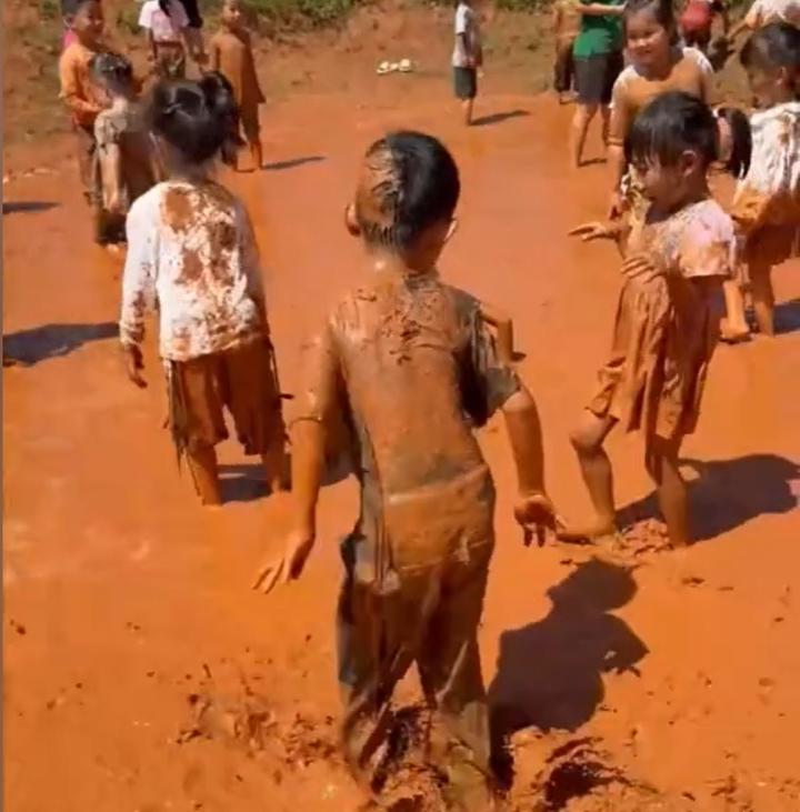 孩子们在学校特意打造的泥潭里