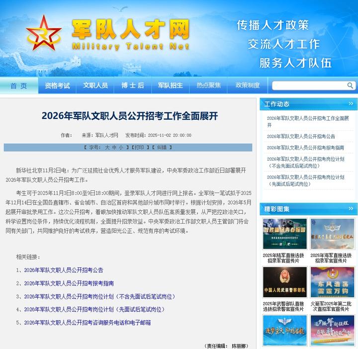 考生可于2025年11月3日8:00至9日18:00期间,登录军队人才网进行网上报名。全军统一笔试拟于2025年12月14日在全国各直辖市、省会城市、自治区首府和其他部分城市同时举行。根据计划安排,2026年5月起展开审批录用工作。这次公开招考,着眼加快推动军队文职人员队伍高质量发展,从严把控政治关口,科学设置岗位条件,持续优化流程机制,全面提升招录效益。中央军委政治工作部文职人员主管部门将会同有关部门,共同维护良好的考试秩序,营造阳光公正、规范有序的考试环境。