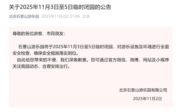 11月2日晚,北京石景山游乐园发布“关于2025年11月3日至5日临时闭园的公告”。
