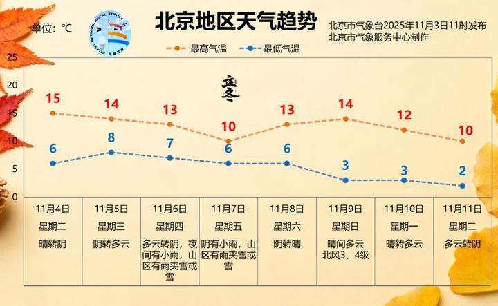 北京市气象台11月3日20时发布:今天夜间晴,南部地区有轻雾或雾,南转北风一二级,最低气温2℃;明天白天晴转多云,北转南风二三级,最高气温15℃。