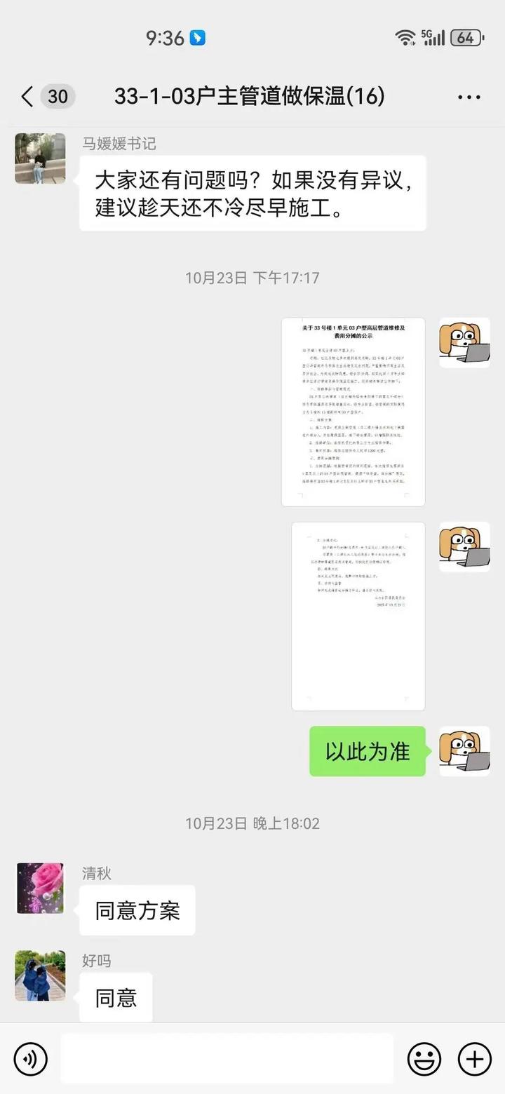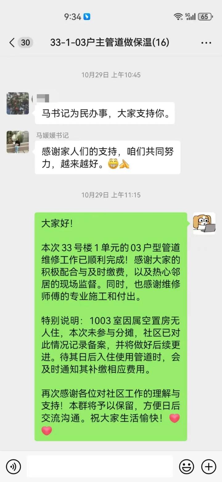 找到问题只是第一步,如何让十几户居民心往一处想,劲往一处使,才是真正的难题。10月23日,为了确保公平公开,网格员起草维修公示。新建“33-1-03户主管道做保温”微信群,微信群里的公示截图引来接连点赞。网格员多次上门,给相关业主解释维修方案让他们签字,对于不在家的住户,再逐一电话联系沟通:“您好,我是社区网格员,关于管道维修的方案……”消弭顾虑后,让业主在群内接龙表态。10 月 24 日,803、1103 的热心居民专程到社区:“就怕修了还堵!” 马媛媛拿着维修公示细细讲解:“保温层选的是耐寒材料,地下埋层比原来深,绝对一步到位!” 最终所有涉及业主全票通过方案。正如居民在群里说的:“公开了,咱心里就踏实了!”