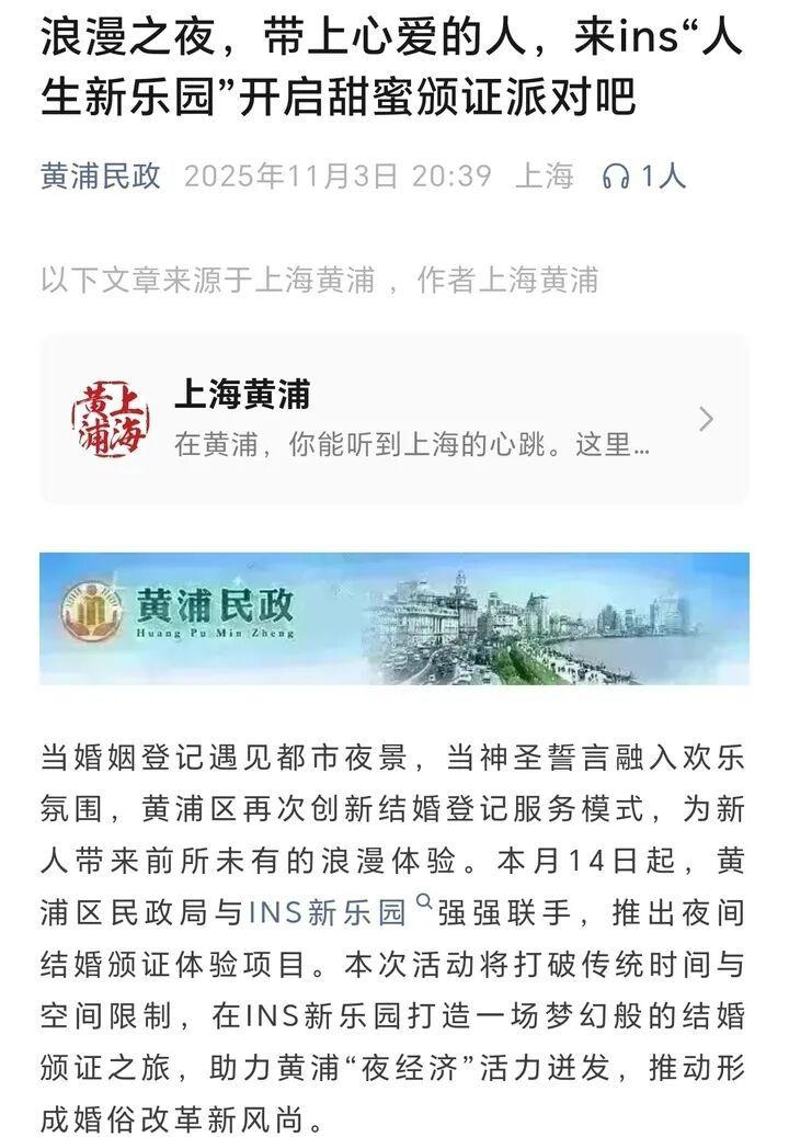 新黄河记者注意到,黄浦区民政局的官方微信公众号“黄浦民政”于11月3日晚推出一篇《浪漫之夜,带上心爱的人,来ins“人生新乐园”开启甜蜜颁证派对吧》的文章。文章称,本月14日起,黄浦区民政局与INS新乐园强强联手,推出夜间结婚颁证体验项目。本次活动将打破传统时间与空间限制,在INS新乐园打造一场梦幻般的结婚颁证之旅,助力黄浦“夜经济”活力迸发,推动形成婚俗改革新风尚。据了解,INS新乐园是位于上海黄浦区复兴公园内的综合性娱乐商业体。