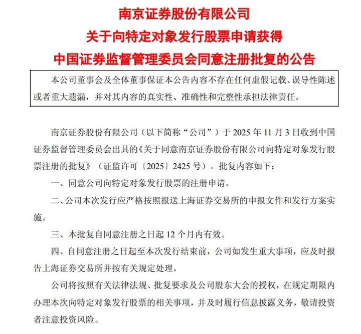 南京证券此次定增最初起始于两年多前。2023年6月,南京证券首次发布定增预案;2025年5月16日,获上交所受理;9月29日,获上交所审核通过;11月3日,获证监会批复。