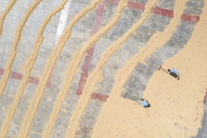 人们在镇政府广场上晾晒粮食 黄伟 摄