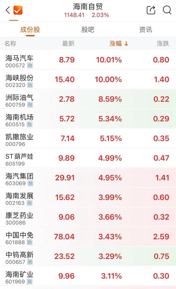 海南板块异动拉升,海马汽车(000572)开盘1分钟涨停。截至发稿,海峡股份涨停,海南机场、海南发展等跟涨。