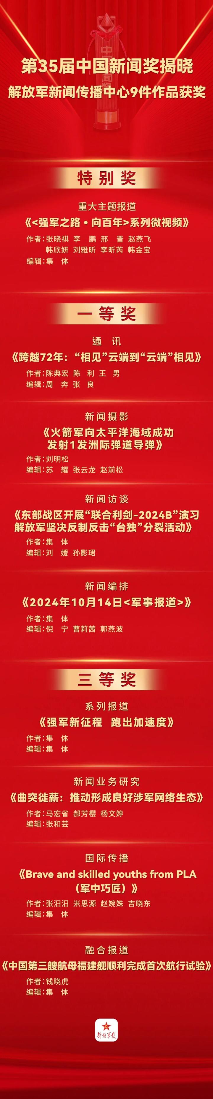 由中华全国新闻工作者协会主办的第35届中国新闻奖评选结果于11月5日揭晓。来自各级各类媒体的377件作品获中国新闻奖,其中,特别奖4件、一等奖74件、二等奖113件、三等奖186件。祝贺!解放军新闻传播中心9件作品榜上有名。