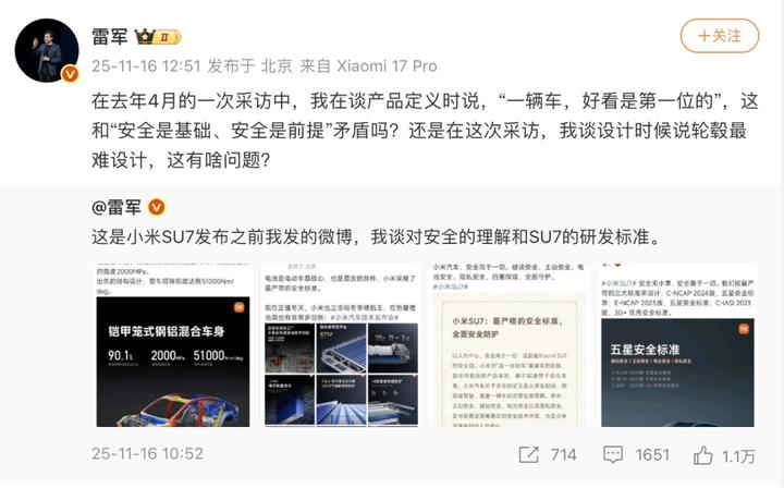在原采访视频中,雷军曾表示“一辆车好看是第一位的”,随后被指为“小米汽车重颜值轻安全”,质疑其忽视安全标准。在11月16日的微博网友评论下面,雷军称,“网上有不少人断章取义,歪曲抹黑”。