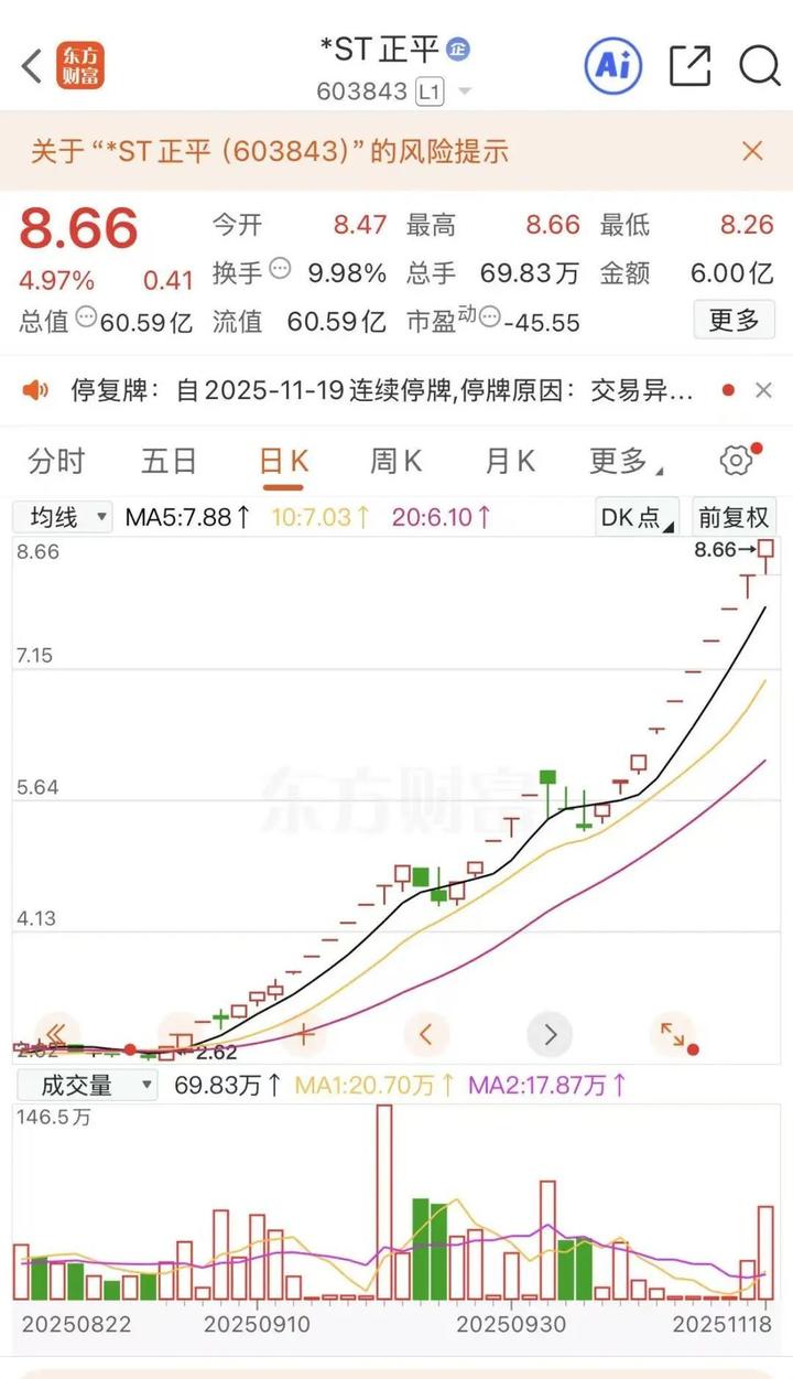 值得注意的是,自11月12日复牌起,5个交易日内,*ST正平已连收5个涨停板。而就在17日,公司发布了风险提示公告(详见4连涨停,603843再次提示风险!)。