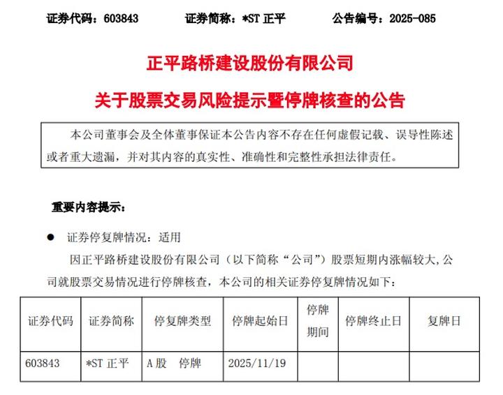 18日晚间,*ST正平(603843)公告称,公司股票自2025年9月1日至11月18日累计涨幅达221.93%,股价短期涨幅与同期上证指数、建筑行业存在严重偏离,已严重脱离基本面。公司股票自2025年11月19日(星期三)开市起停牌核查,自披露核查公告后复牌,预计停牌时间不超过10个交易日。