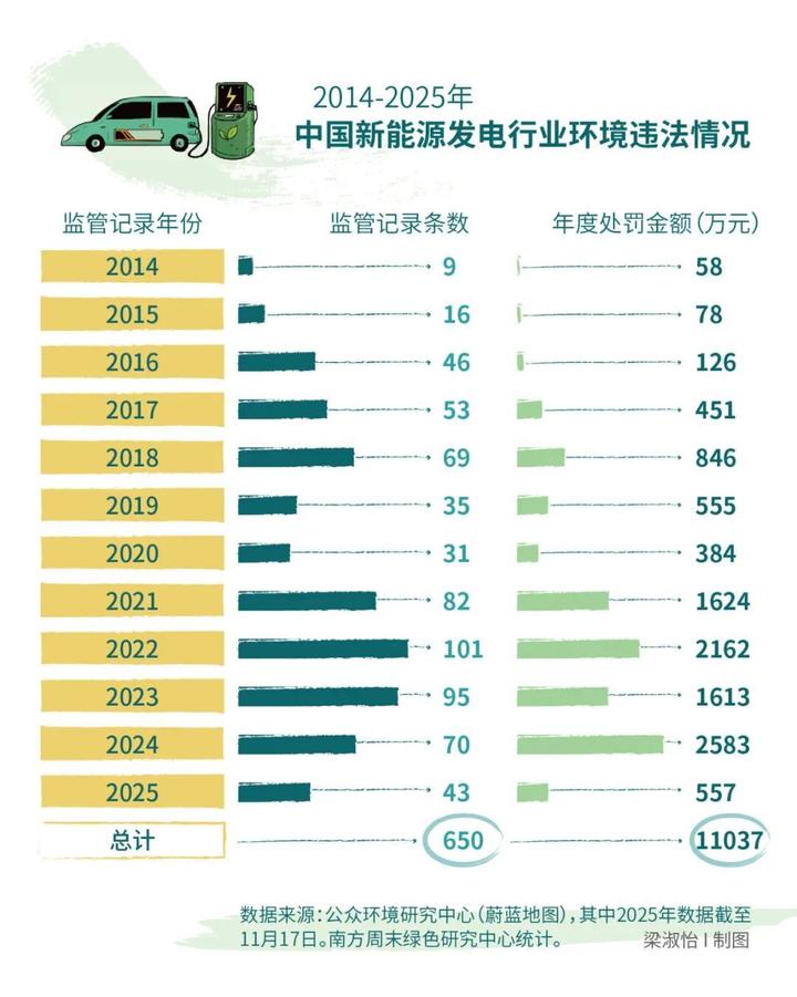 根据公众环境研究中心(蔚蓝地图)通过公开渠道收集的2014年至2025年的企业环境监管数据,南方周末绿色研究中心统计发现,新能源发电企业(如风力发电、光伏发电等)中涉及罚款的环境监管记录共650条。