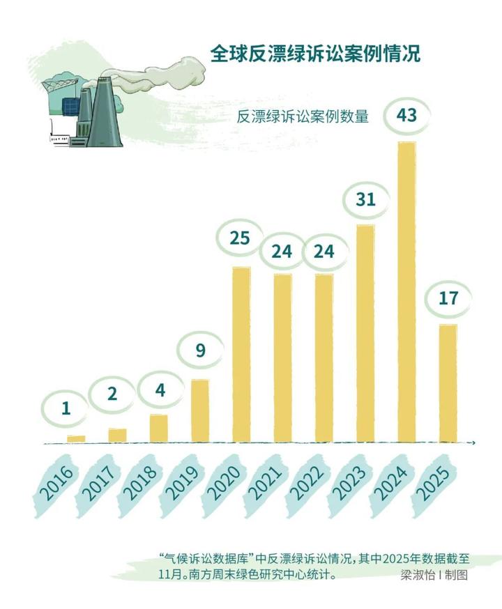 南方周末绿色研究中心在哥伦比亚法学院支持的“气候诉讼数据库”(The Climate Litigation Database)搜索“漂绿(greenwashing)”关键词,仅2024年和2025年期间,由消费者等利益相关方提起的反漂绿诉讼就高达60起。