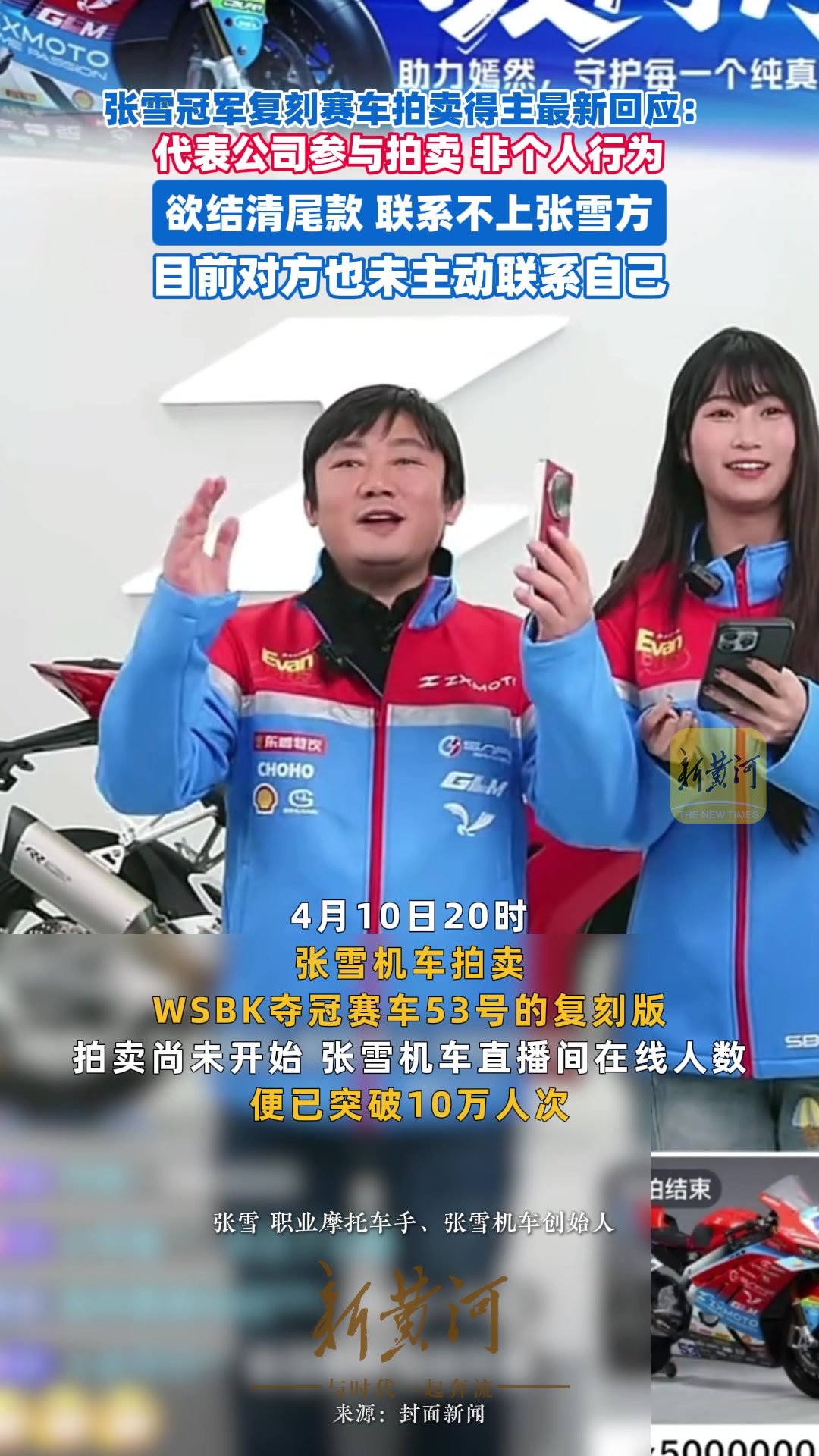 张雪冠军复刻赛车拍卖得主最新回应:代表公司参与拍卖,非个人行为。欲结清尾款,联系不上张雪方,目前对方也未主动联系自己