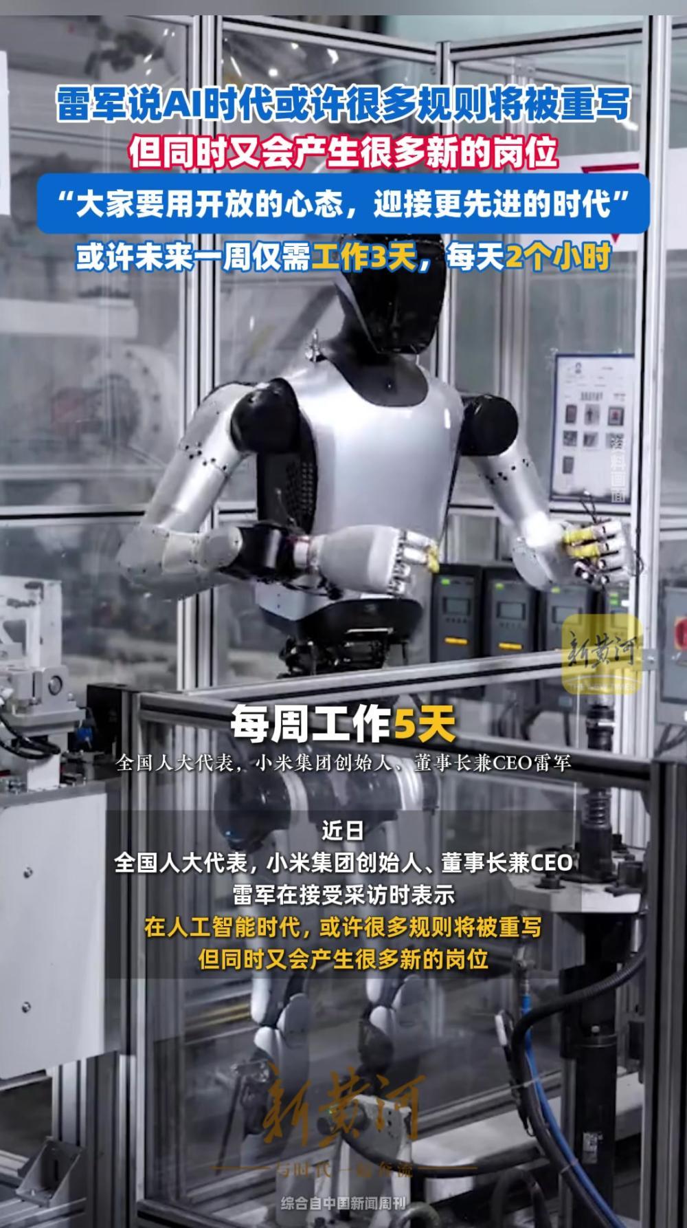 雷军说AI时代或许很多规则将被重写,但同时又会产生很多新的岗位,未来每周或仅需工作3天
