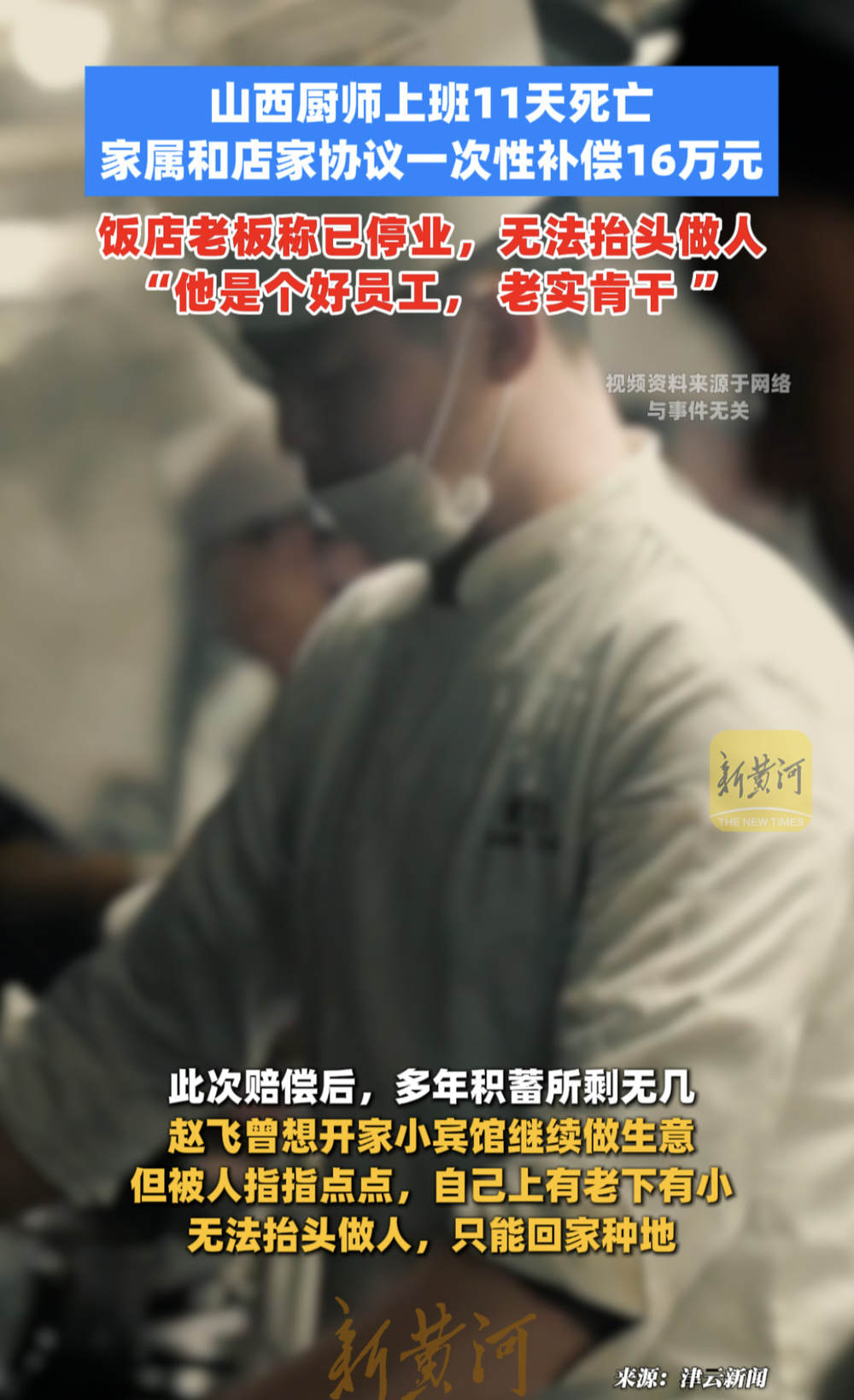 山西厨师上班11天死亡,家属和店家协议一次性补偿16万元。饭店老板称已停业,无法抬头做人,“他是个好员工, 老实肯干 ”