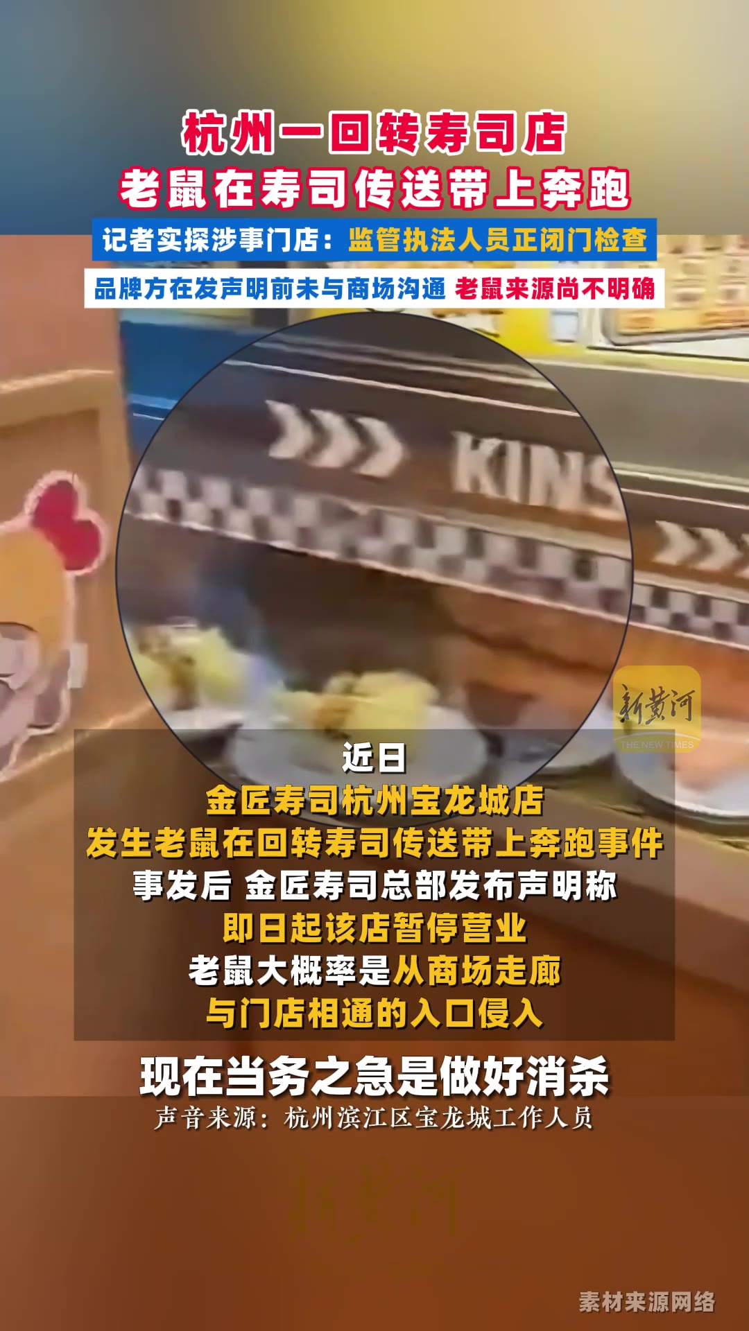 杭州一回转寿司店老鼠在寿司传送带上奔跑,记者实探涉事门店:监管执法人员正闭门检查