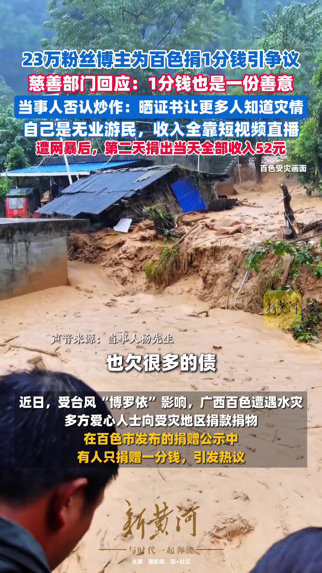 23万粉丝博主为百色抗洪捐1分钱引争议,当事人否认炒作。慈善部门:1分钱也是善意