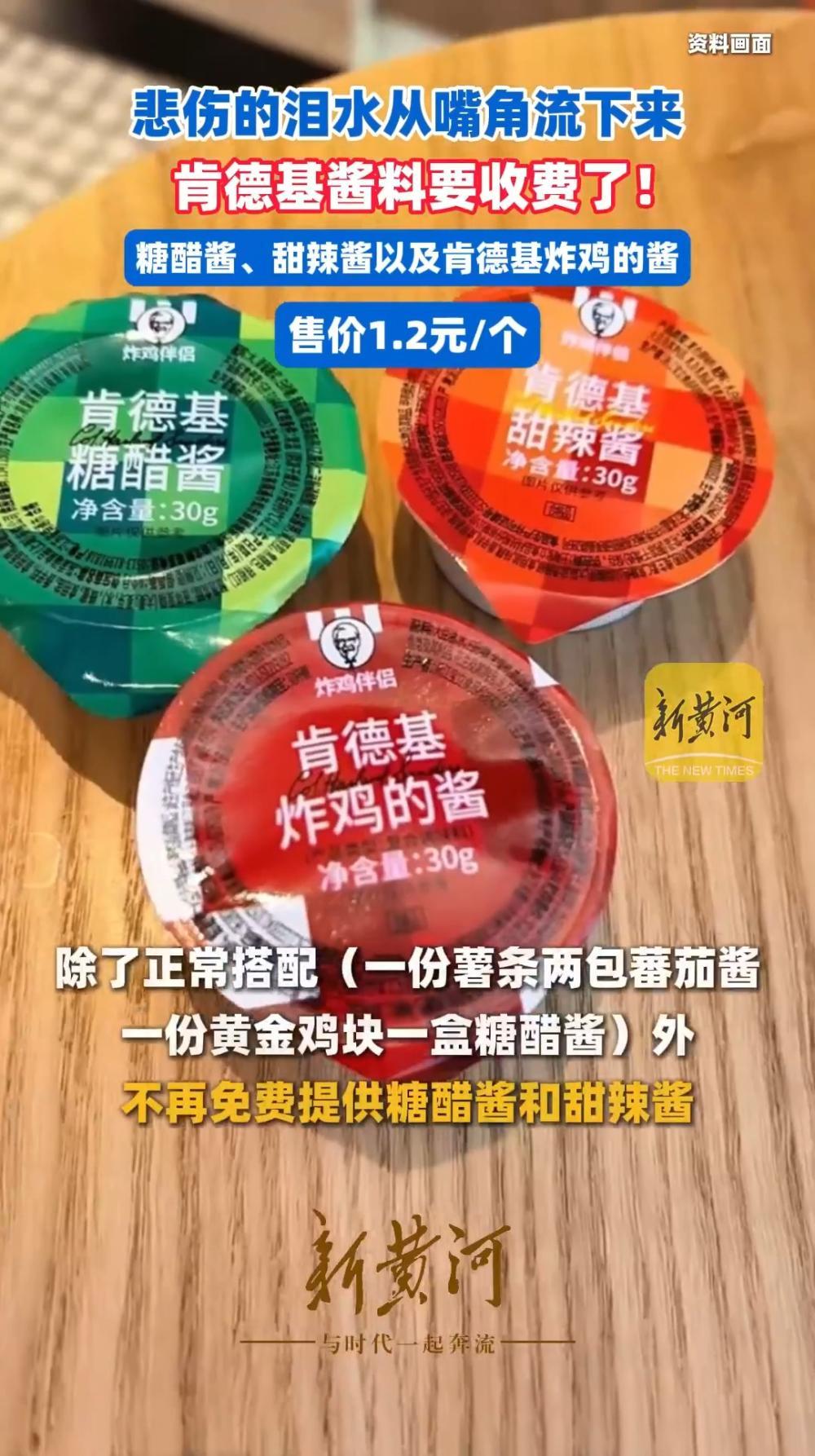 悲伤的泪水从嘴角流下来,肯德基酱料要收费了!糖醋酱、甜辣酱以及肯德基炸鸡的酱,售价1.2元/个