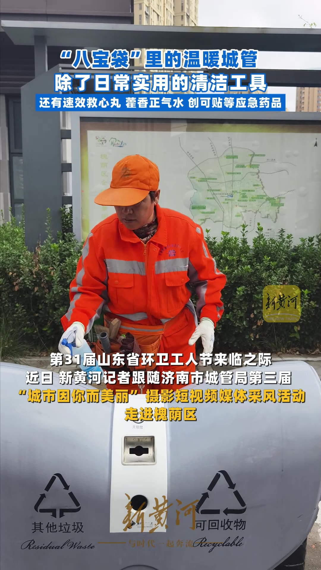 “八宝袋”里的温暖城管 ,除了日常实用的清洁工具,还有速效救心丸、藿香正气水、 创可贴等应急药品