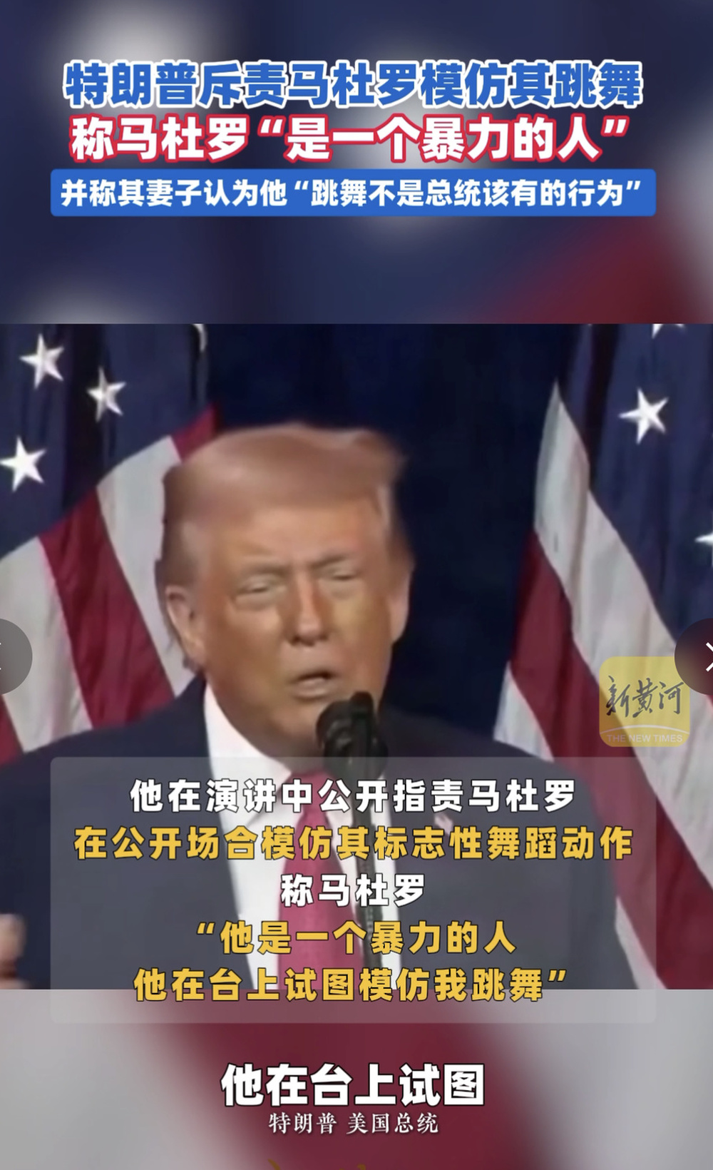 特朗普斥责马杜罗模仿其跳舞,称马杜罗“是一个暴力的人”,并称其妻子认为他“跳舞不是总统该有的行为”