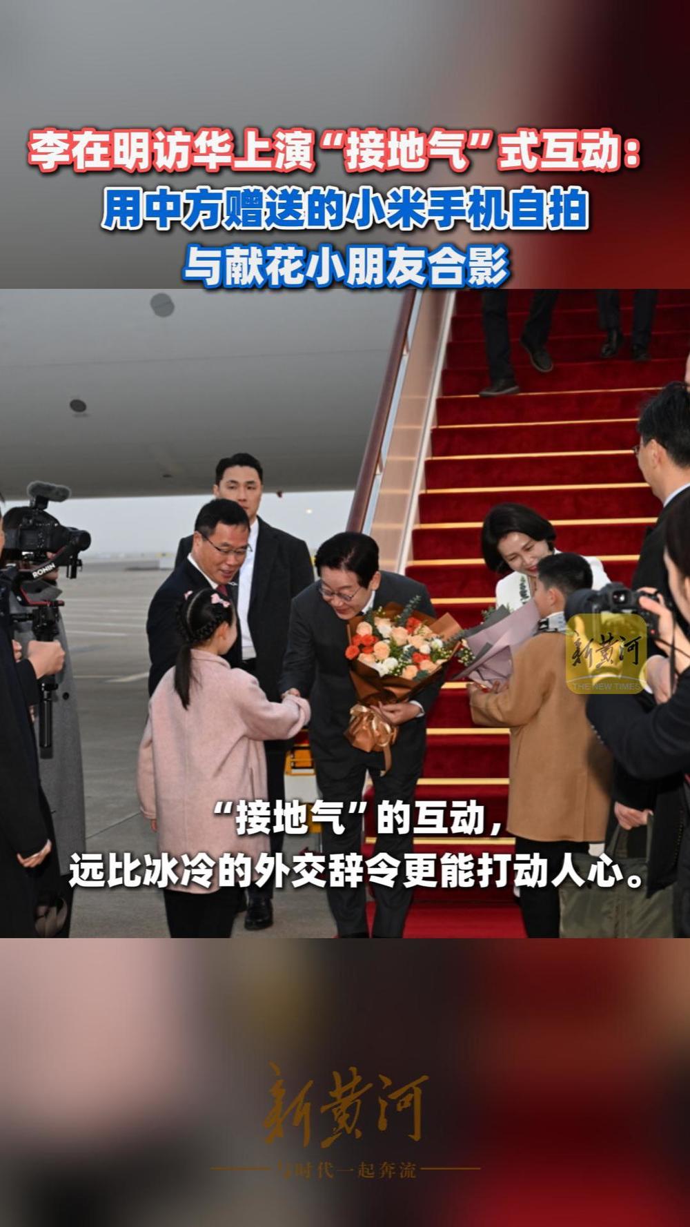 李在明访华上演“接地气”式互动:用中方赠送的小米手机自拍,与献花小朋友合影