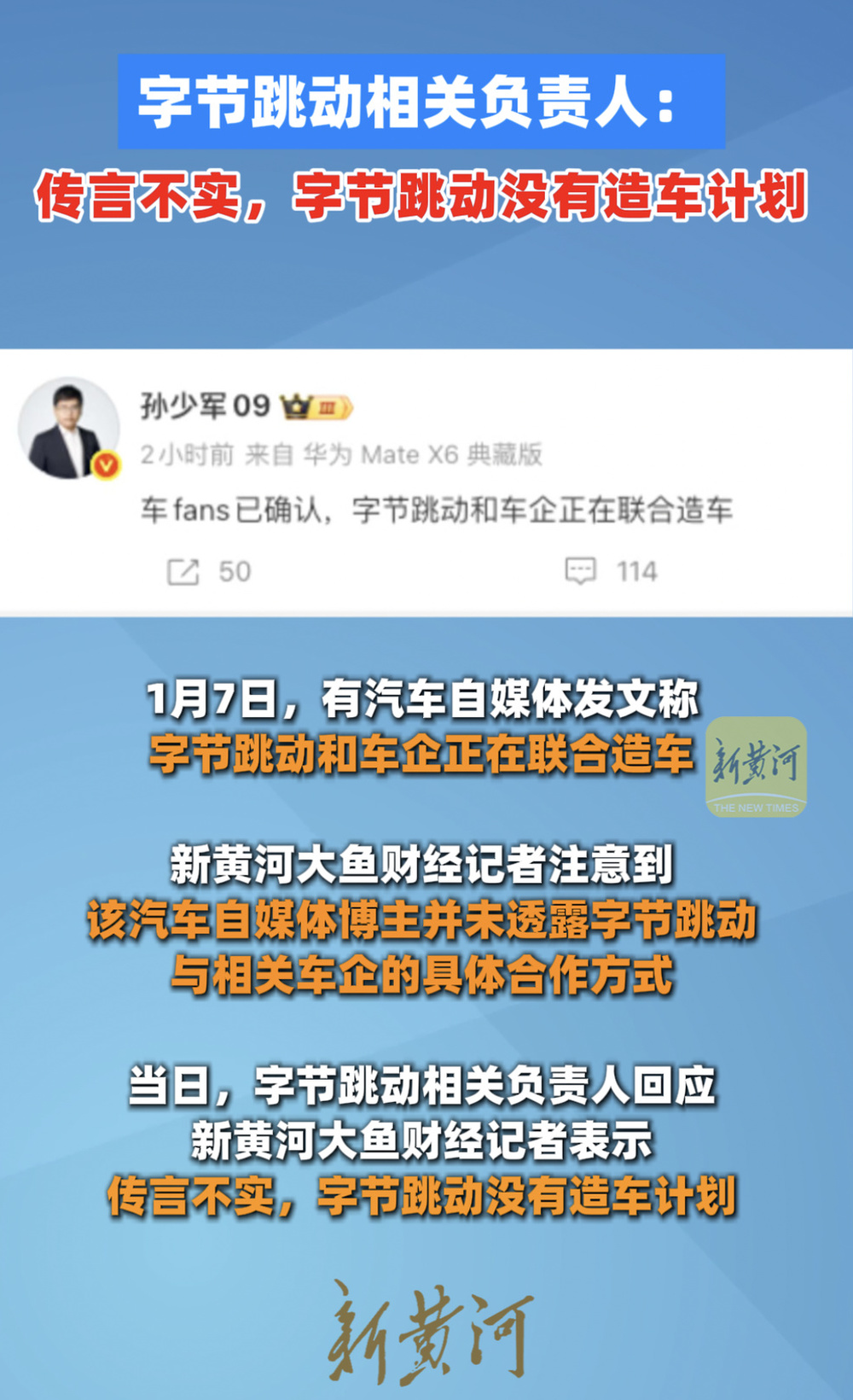 字节跳动相关负责人:传言不实,字节跳动没有造车计划