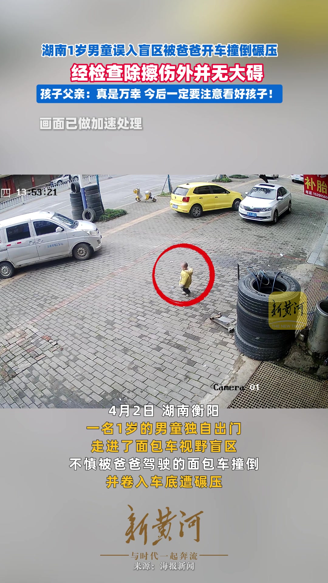湖南1岁男童误入盲区被爸爸开车撞倒碾压,经检查除擦伤外并无大碍。孩子父亲:真是万幸,今后一定要注意看好孩子