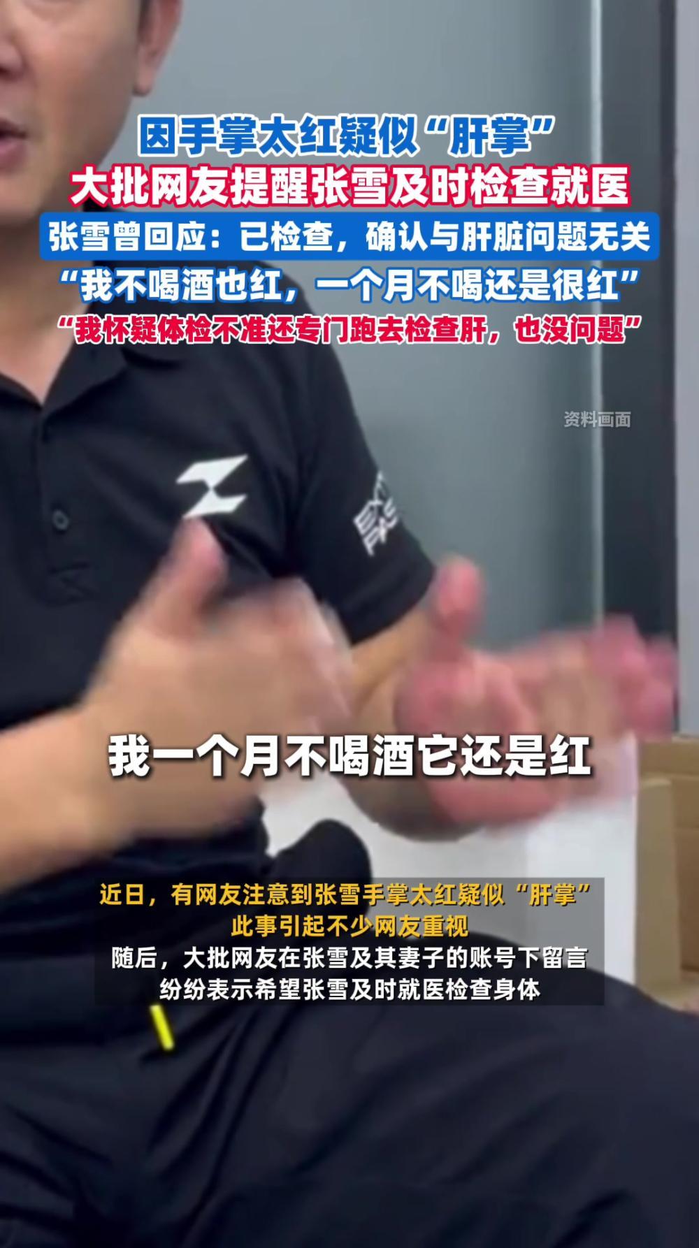 因手掌太红疑似肝掌,大批网友提醒张雪及时就医,张雪回应 :已做专项检查,确认与肝脏问题无关