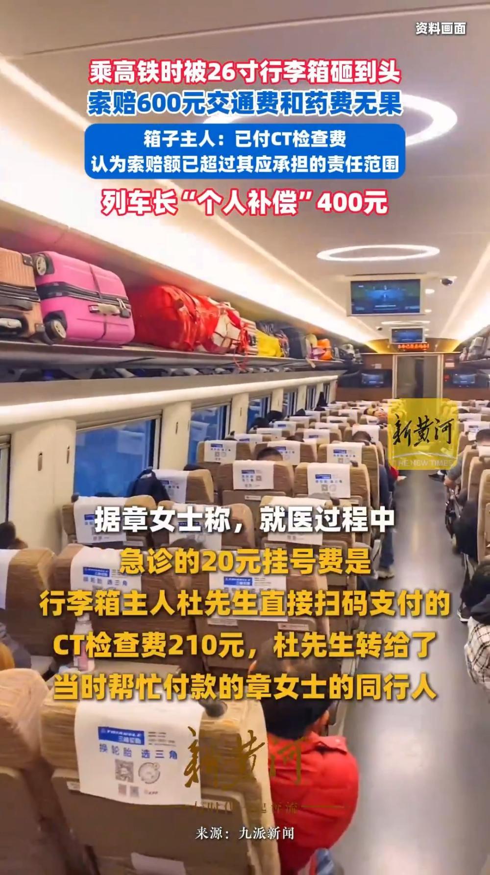 乘高铁时被26寸行李箱砸到头,索赔600元交通费和药费无果,箱子主人:已付CT检查费,认为索赔额已超过其应承担的责任范围,列车长“个人补偿”400元