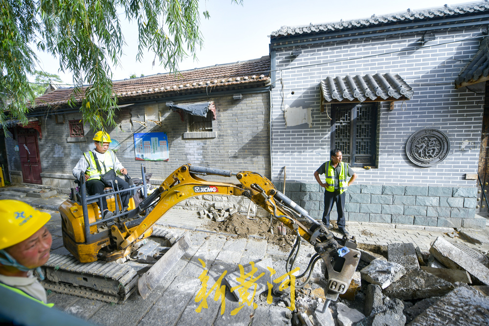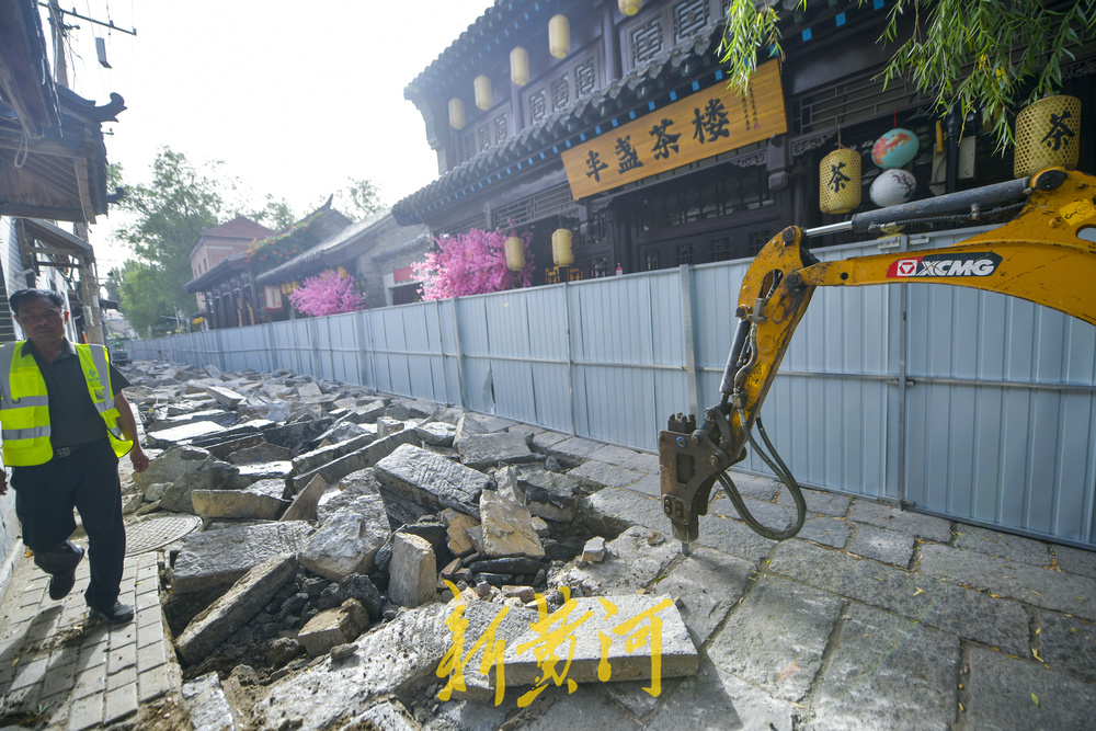 施工人员利用机械设备将原来路面上铺设的石板全部撬起,将在地下铺设直饮水管道、高压电力管、通信管、自来水管、路灯管、亮化管预埋。