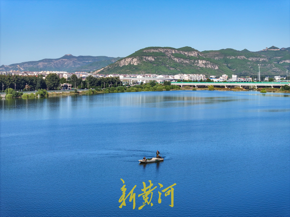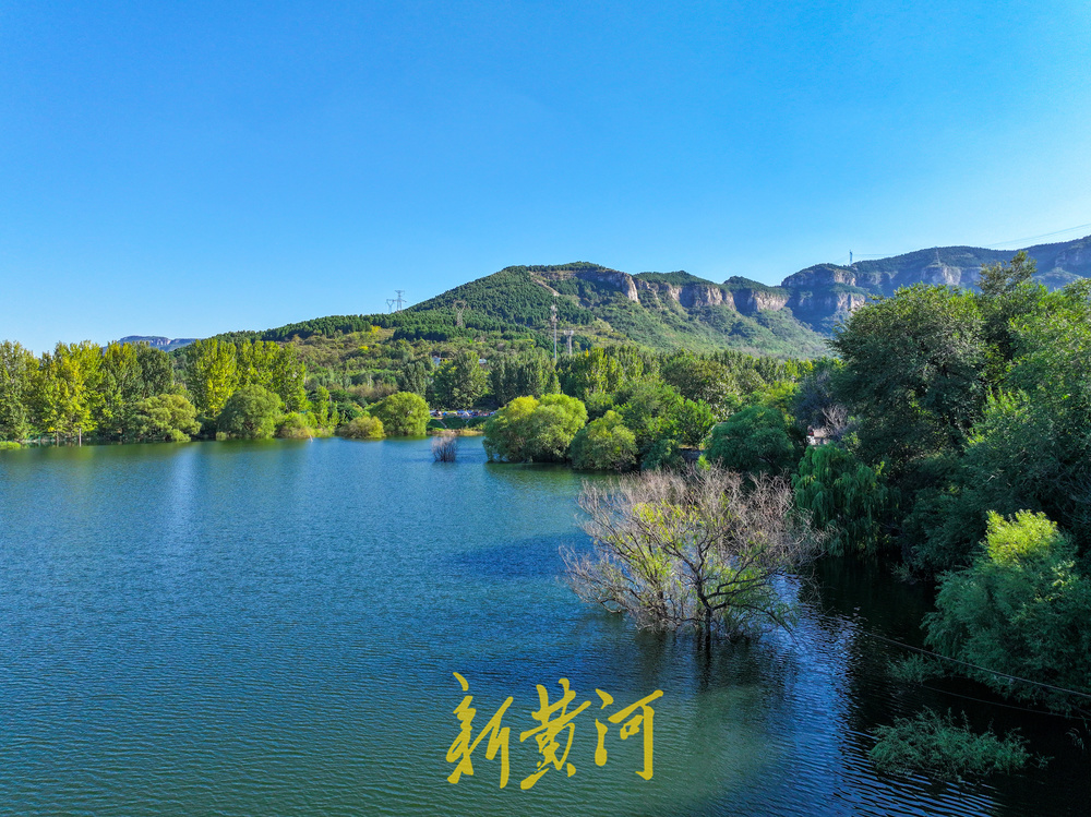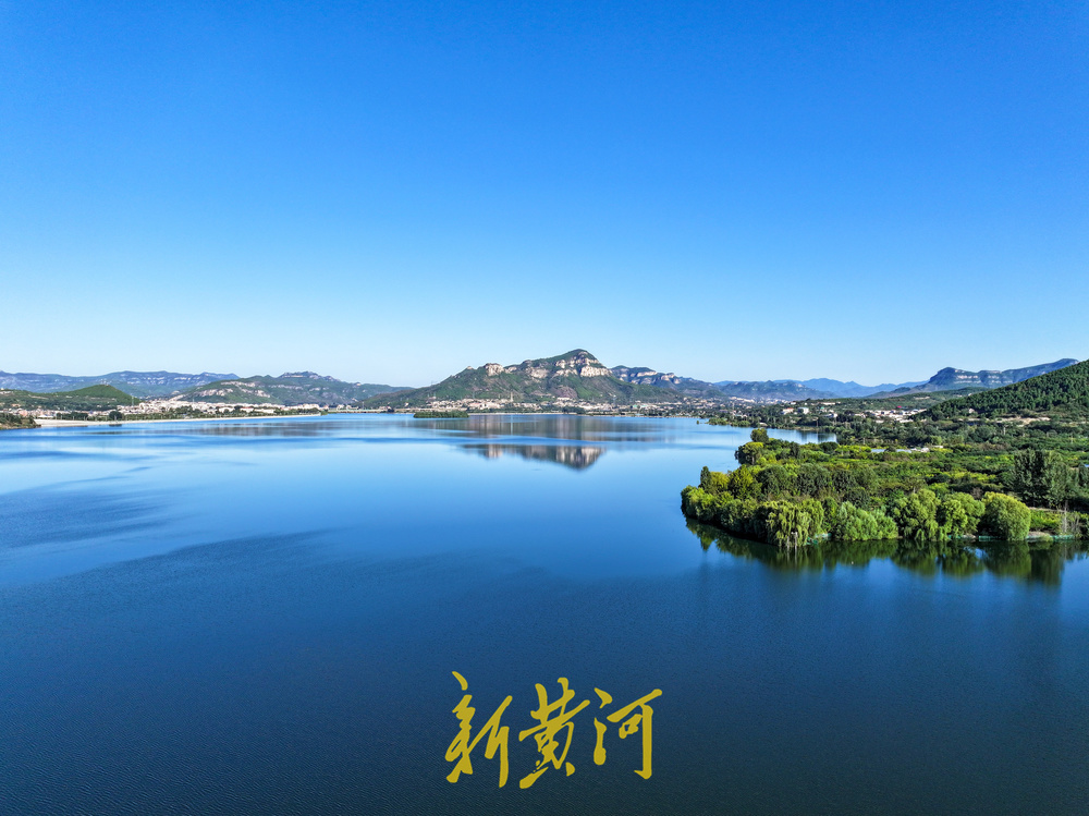 10月4日,天蓝水碧,济南卧虎山水库的景色如诗如画,吸引了众多游客前来赏秋。