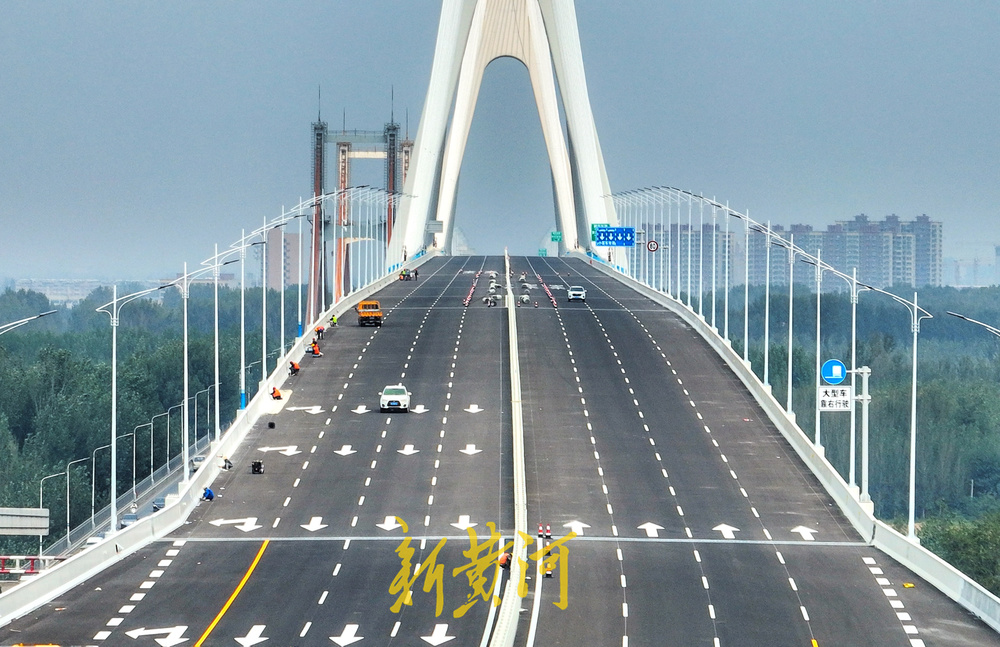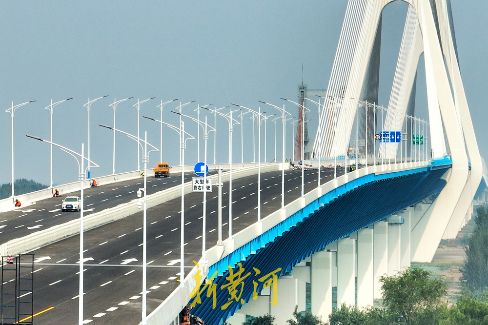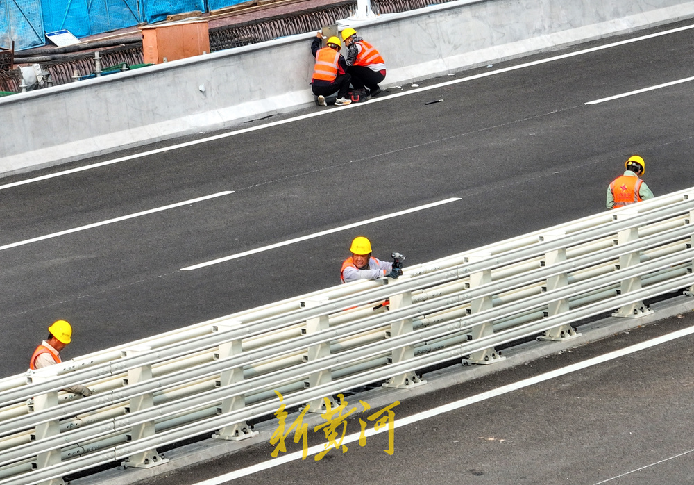10月9日,记者在新济南黄河大桥南段引桥上看到,工人们正在桥面上安装路灯、指示牌、安全设备等辅助设施,规划车道线,为最后的通车全力冲刺。