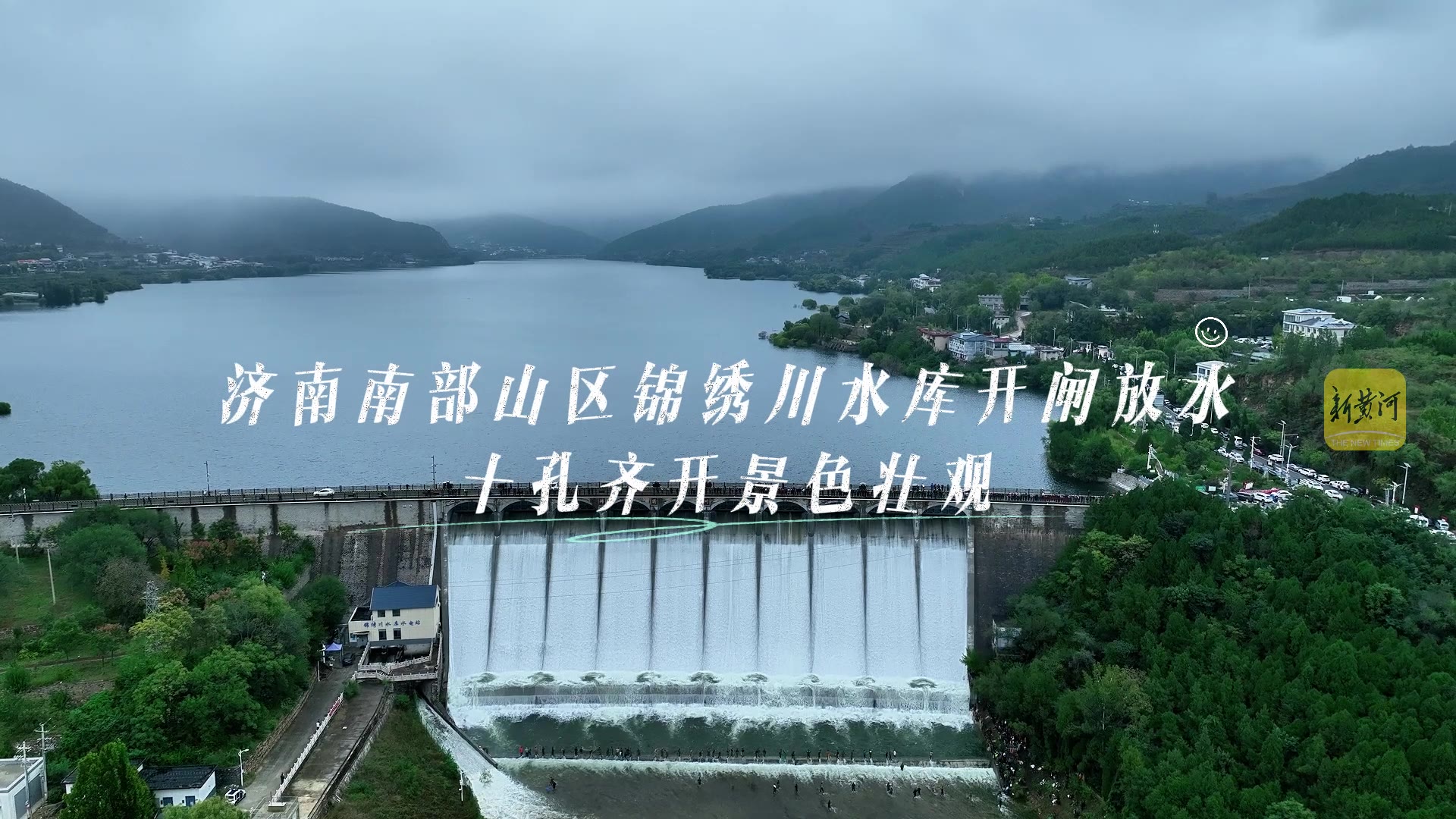 济南南部山区锦绣川水库开闸放水,十孔齐开景色壮观