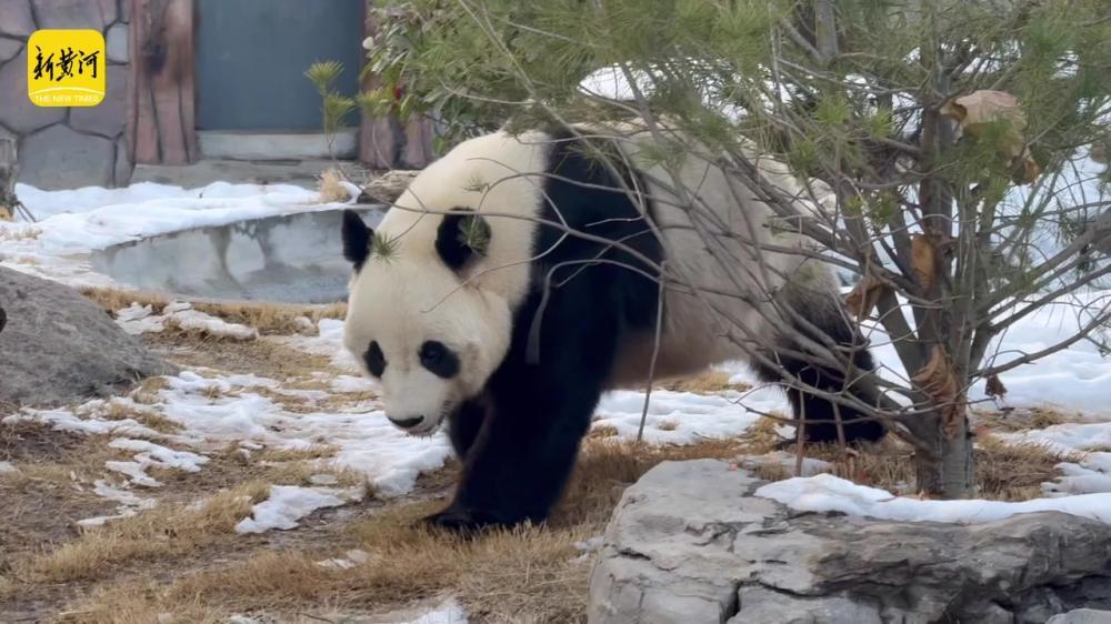 济南雪后初霁 大熊猫雅吉踏雪嬉戏引游人驻足