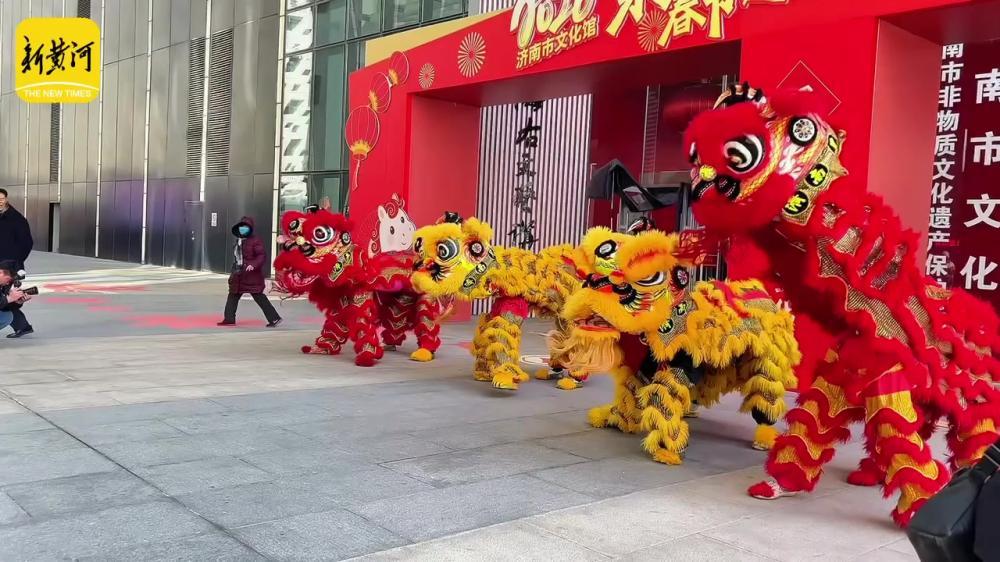 正月初一贺新春 济南文化馆门前传统舞狮来拜年