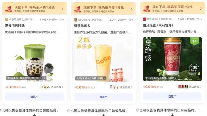 一大早,已经有上海消费者晒出了AI请的奶茶:瑞幸咖啡、霸王茶姬、奈雪的茶、沪上阿姨、茶百道……各种茶饮品牌都能用。