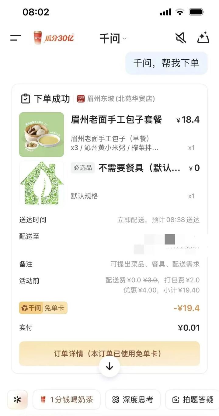 同时,网友也可以通过千问APP发起外卖需求,使用免单卡。