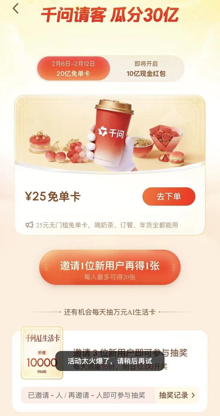 根据千问APP发布的活动规则,第一波免单活动时间为2月6日-2月12日,除了赠送免单卡外,当日累计成功邀请3位新朋友网友,还能获得抽奖机会,抽取价值万元的千问AI生活卡。