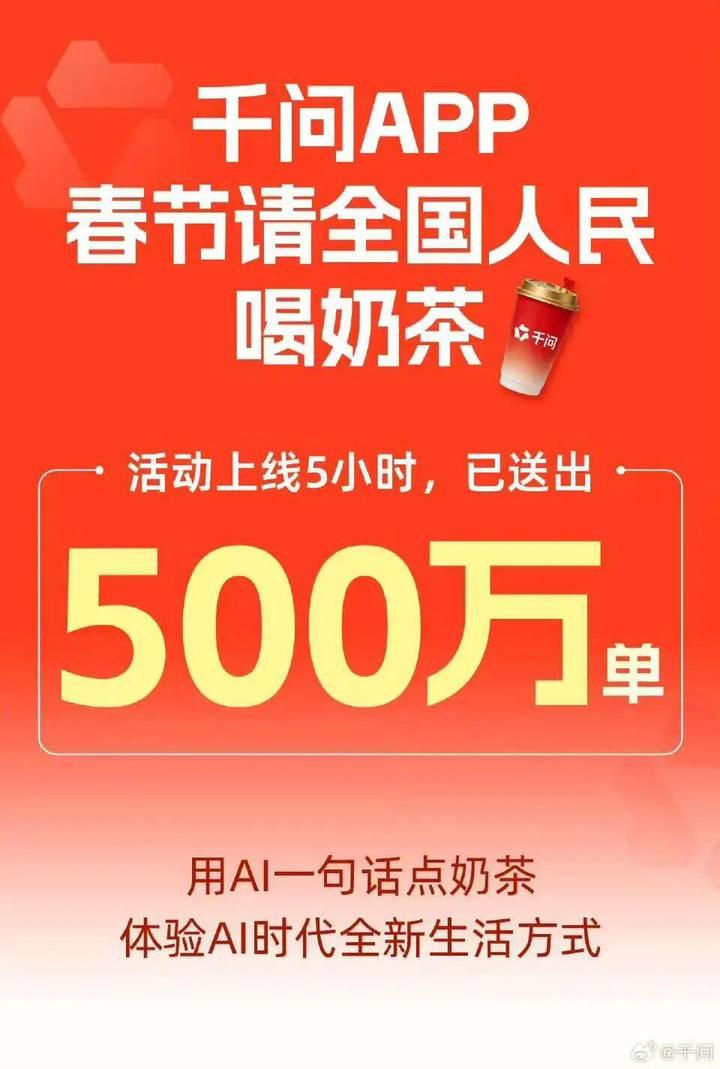 2月6日一早,千问APP“春节30亿大免单”正式上线,发动奶茶攻势,邀请全国人民用AI一句话免费点奶茶。