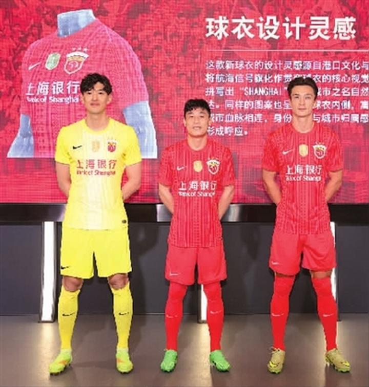 签约仪式现场,俱乐部球员代表武磊、颜骏凌和安永佳身着2026赛季全新主场战袍登台,展示了印有“上海银行”标识的新赛季球衣。球衣设计灵感源自港口文化与航运传统,将航海信号旗图案化作视觉语言,反复拼写出“SHANGHAI”字样,象征着球队与城市血脉相连。