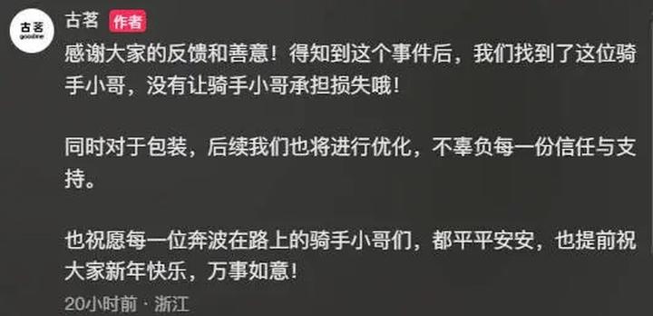 记者注意到,古茗官方也通过社交账号回应称,得知这起事件后,已找到了这位骑手小哥,没有让骑手小哥承担损失。同时对于包装,后续也将进行优化。