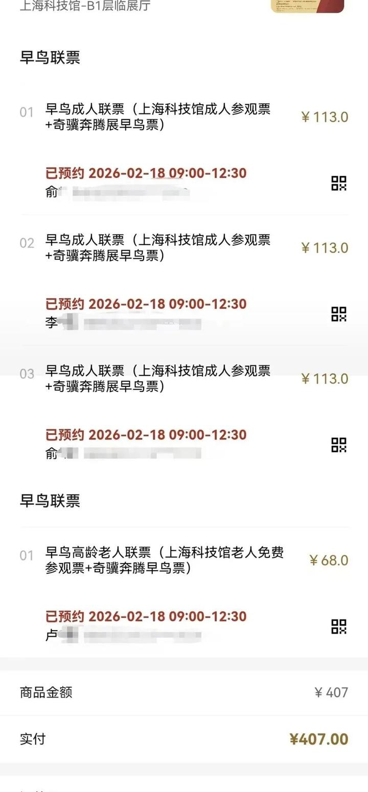 △俞先生一家四口早早订好了春节假期上海科技馆参观联票