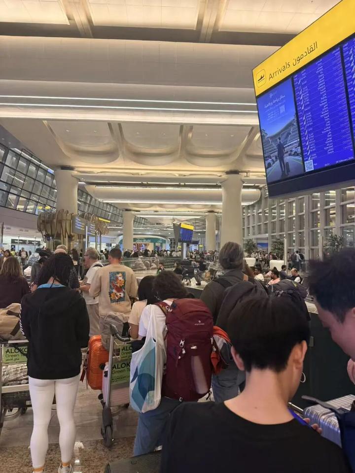 “28日早上起来的时候其实就看到关于美国以色列攻击伊朗的新闻,当时我们还有一些侥幸心理,因为我们的飞机来的时候是从印度上空过来的,也不去伊朗方向,觉得空中管制可能不会影响到我们太多,直到看到阿联酋这边宣布关闭领空,然后我们的前序航班也是返航,但也没明确告诉我们航班会取消。我们在等车的时候,天空上已经连续听到了好几声导弹被拦截爆炸的声音。下午5、6点抵达机场,工作人员过来跟我们说机场现在没有航班,让我们离开,出发层柜台这边都是空的。”