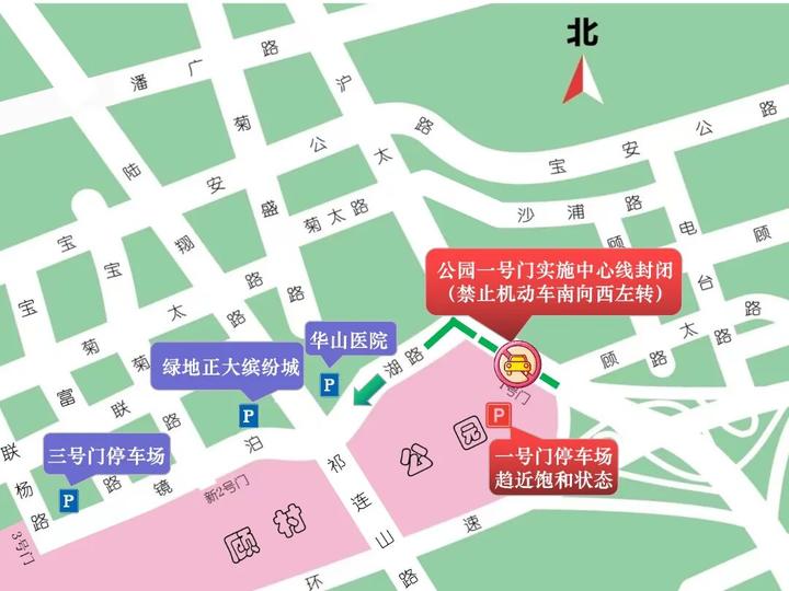 当沪太公路顾村公园1号门停车场接近饱和时,封闭公园1号门中心隔离,机动车至沪太公路镜泊湖路左转,沿镜泊湖路按绿地正大缤纷城、公园3号门停车场、华山医院顺序依次有序停车。