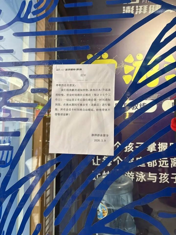 目前,该游泳馆已经暂停营业,有不少工作人员在四周,阻止人员进入。根据贴在游泳馆玻璃门上的告示显示,泳池注水/升温速度较慢,营业时间将往后推迟,在换水期间,会员可移步至别的分店进行锻炼。落款时间为3月9日。