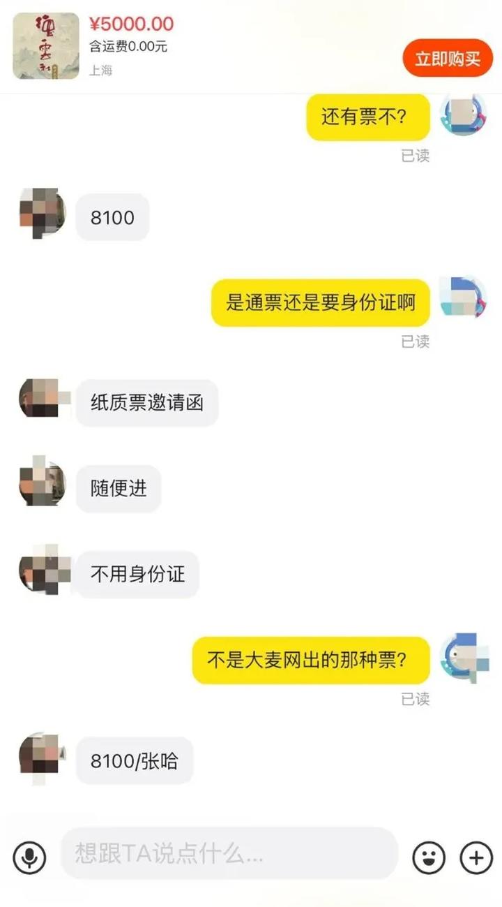 卖家表示,门票为纸质的邀请函,座位可安排在第三排。对方还发来和其他买家的聊天记录及一张邀请函图片,证明邀请函真实有效,可以进入观看。