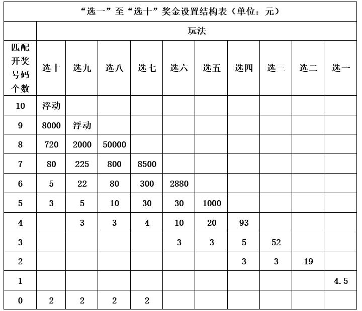快乐8游戏按不同玩法设奖,“选九”玩法中“选九中九”奖级、“选十”玩法中“选十中十”奖级采用浮动奖金设奖,其他玩法及奖级均采用固定奖金设奖,单注奖金规定如下: