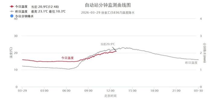 上海今天上午天气晴好,午后云系增多,全市大部分地区的最高气温都超过了20℃,市区徐家汇站22.1℃,郊区中嘉定站23.9℃全市最高,白天户外体感有些热!