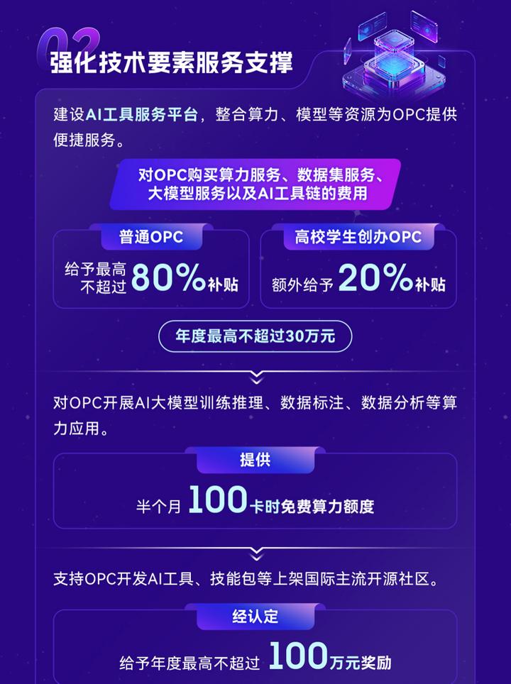 《若干措施》明确,对OPC购买算力服务、数据集服务、大模型服务以及AI工具链的费用,给予最高不超过80%的补贴;高校学生创办的OPC,可额外享受20%补贴,年度补贴最高可达30万元。所有OPC均可直接申领半个月100卡时的免费算力额度,零成本开启AI研发工作。更值得关注的是,政策专门设置了技术创新专项奖励,OPC开发的AI工具、技能包等上架国际主流开源社区,经认定可获得年度最高不超过100万元的奖励,真金白银鼓励技术创新与全球化落地,让OPC创业团队的创新价值得到充分认可。