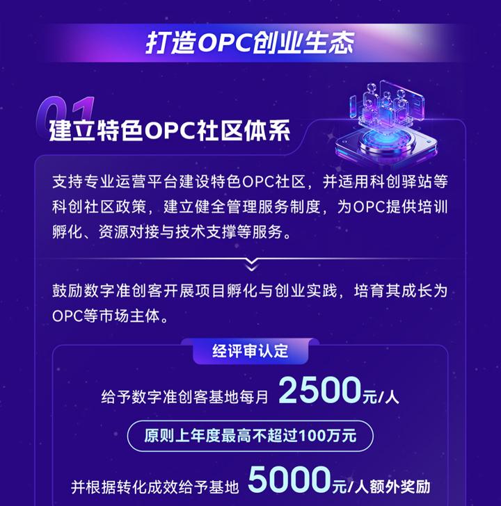 政策支持专业运营平台建设特色OPC社区,并适用科创驿站等科创社区政策,配套培训孵化、资源对接与技术支撑服务;对数字准创客孵化基地,给予每月2500元/人的运营补贴,原则上年度最高不超过100万元,还可根据项目转化成效享受5000元/人的额外奖励;对建设AI工具服务、数据服务等功能性平台的机构,按年度服务成效给予最高不超过100万元奖励。